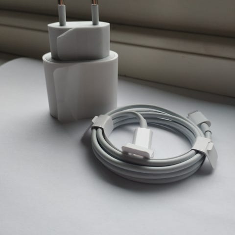 Apple lader i hvit farge. Rund ladeplate med fastmontert kabel og USB‑C‑kontakt. Egnet som trådløs lader til kompatible Apple-enheter som støtter denne typen lading. Kabelen gir tilkobling til strømforsyning eller annen kompatibel USB‑C-strømkilde.