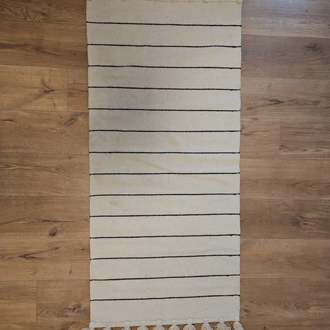 Stripete teppe i rektangulær form med hvit bunnfarge og smale svarte striper på tvers. Teppebredden er målt til omtrent 70 cm og lengden til omtrent 140 cm, basert på målebåndet på bildene. Passer for eksempel i gang, entré eller mindre oppholdsrom. Materialet fremstår som vevd tekstil.