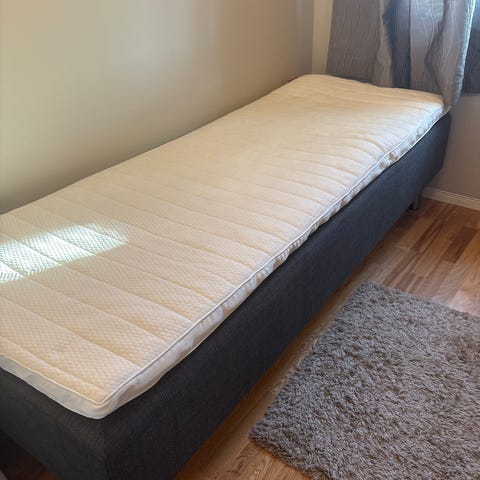 Rammemadrass med bein fra Jysk gis bort mot henting. Følger ikke med overmadrass. Det ene beinet er knekt så ett bein er hjemmelaga. Senga er brukt etter dette og funker helt fint.
