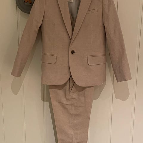 Dress fra HM i bomull (og litt lin) str. 122. Bukse, vest og jakke. Følger også med en sløyfe i samme farge, som ikke er med på bildene. Selges for 300,-