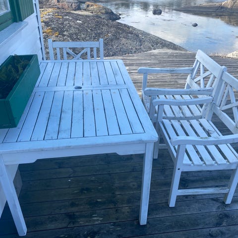 Hagegruppe med rundt bord og to stoler i tre gis bort. Møblene er hvite og består av et rundt bord med bordplate i trelekter og to stoler med rette armlener og spile-rygg og -sete. Passer til bruk på terrasse, hage eller uteplass.
