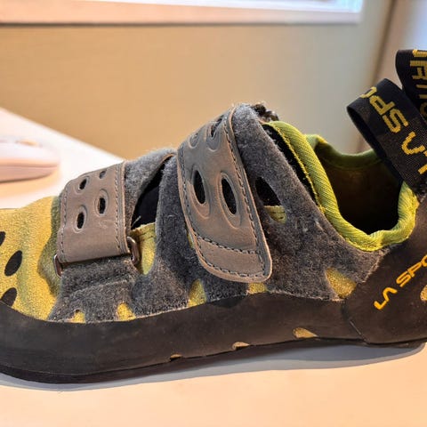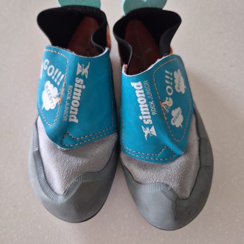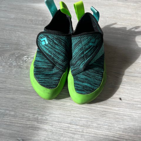 Klatreskoene har gummisåle og overdel i tekstil/skinnmateriale med grafisk motiv. De er utformet for friksjon mot klatreveggen og presis fotplassering. Skoene har nedtrukket gummi rundt tå og hæl for bedre grep.