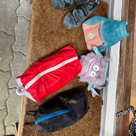Sett med klatreutstyr til barn bestående av klatresele, klatresko str.34 og krittpose med kritt