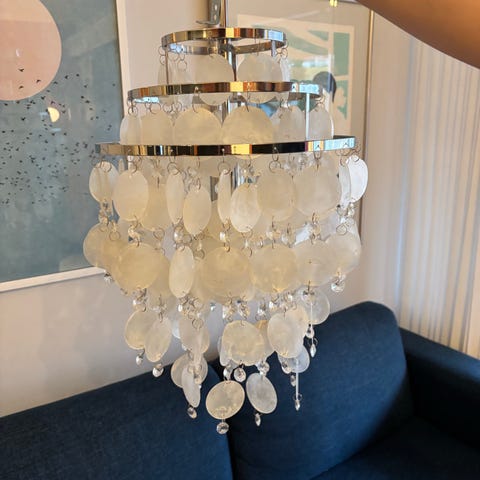 Pen taklampe i stål, med hvite «skjell». Gir godt lys og gjør seg veldig godt over eks spisestue. Selges pga flytting.