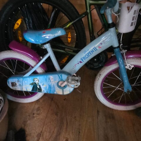 Barnesykkel med støttehjul. Litt usikker på størrelsen. Men tror ikke du får de mindre. Fungerer fint.