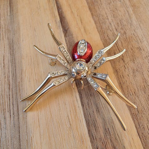 En virkelig nydelig brosje utformet som edderkopp med vakre detaljer og krystaller.