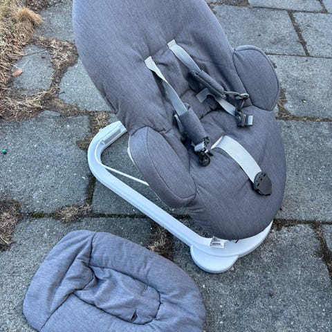 Pent brukt vippestol fra Stokke. Bøyle til leke. Avtagbart trekk som kan vaskes i maskinen. Legges relativt flatt, og holdes sammen ved hjelp av praktisk knapp. Må hentes
