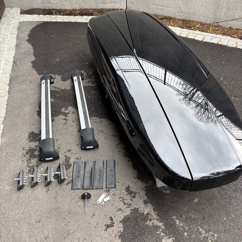 Calix takboks i hvit utførelse. Monteres på takstativ, her vist på Thule-stativ. Boksen har låsing fra begge sider. Egnet for ski og ekstra bagasje på bil, for eksempel ved ferie- og fritidsbruk. Lengde 225, bredde 90 og høyde 28 cm. 430 liter. Har vært brukt både på BMW 320 og nå på Audi Q4.