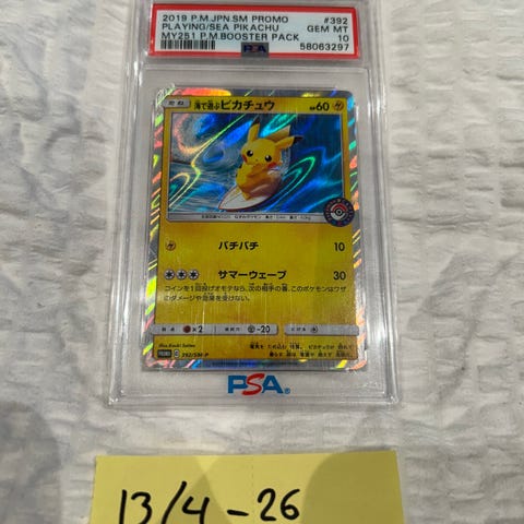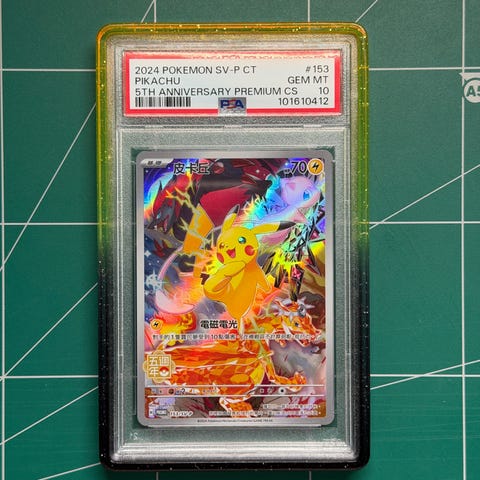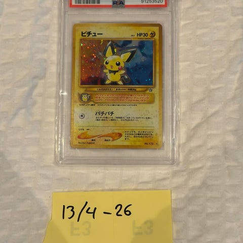 Pokémon Pikachu samlekort i japansk utgave. Kortet er innkapslet og gradert av PSA med karakteren GEM MT 10 og Auto 9