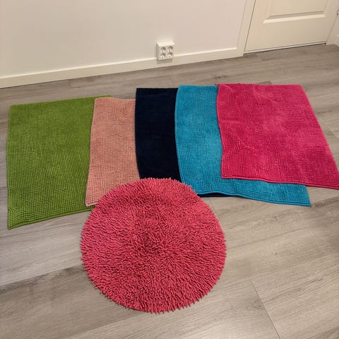 Badematte, badehåndklær, håndklær og vaskekluter.