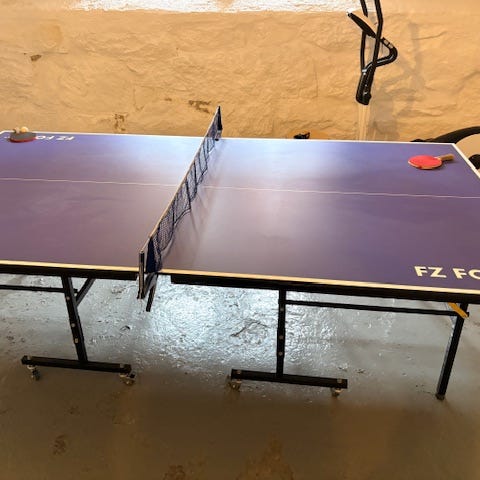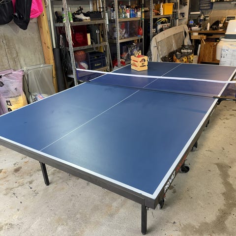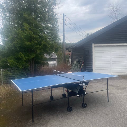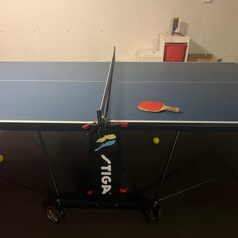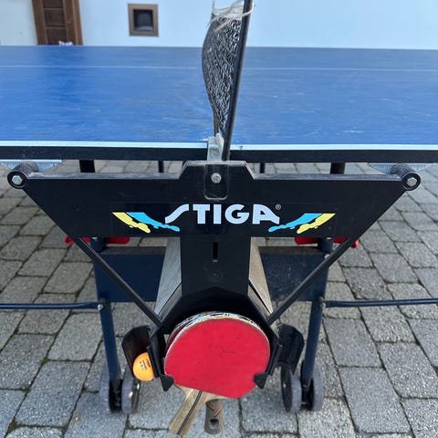 Stiga Outdoor Roller bordtennisbord i blå utførelse. Bordet har sammenleggbart design med to separate bordhalvdeler som kan felles opp for lagring eller solospill. Understellet er i metall med hjul for enkel flytting. Nett følger med, og bordet er egnet for bruk utendørs på terrasse eller lignende jevne underlag. Standard bordtennisstørrelse med tydelig markerte banestreker på spilleflaten. Bordet har en skade i midtkonsollen (se bilde A). Det gjør ikke noe for spillingen, men man må ta litt hensyn dersom man slår sammen bordet til lagring. Det er og litt skjevt i det ene hjørnet (se bilde B) men vi merker ikke noe til det når vi spiller. Vi kan ikke levere bordet.