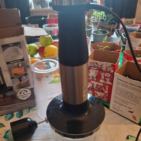 Braun stavmikser med tilbehør. Settet inkluderer motorenhet, beholder med knivinnsats for hakking og lokk/feste + dl-mål. Egnet til hakking, purering og enkel tilberedning av mat på kjøkkenet. Elektrisk modell med ledning. Er brukt en del, men funker fortsatt greit.
