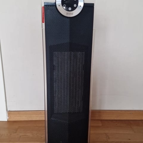 Tårnvifte varmeovn i svart utførelse. Modellen har digitalt display og berøringsknapper på toppen for styring av funksjoner. Enheten står på rund fot og kobles til med vanlig strømkabel. Passer til oppvarming av mindre rom eller som ekstra varmekilde innendørs.