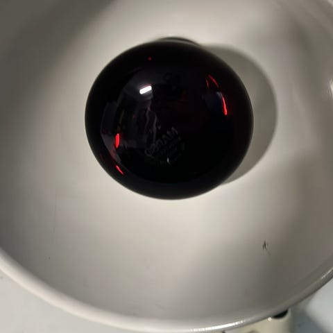 Varmelampe med rød lyspære. Lampa har lang ledning og kjetting for oppheng.