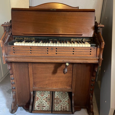 Carpenter Company trøorgel i brunbeiset treverk. Fungerer fint. Produsert av E. P. Carpenter Company, Brattleboro, Vermont, USA, i 1901. Egner seg som musikkinstrument eller som dekorativt møbel i hjem, øvingsrom eller lignende.
