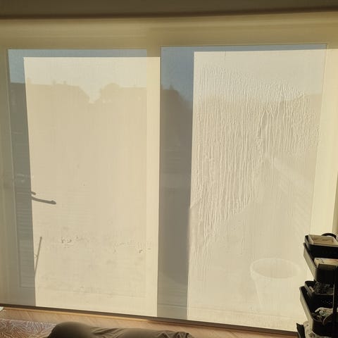 Videre har vi 2 stk Fasade Produkter plissegardiner, en rustrød og en lys blå. Disse er 195 cm brede. Kan trekkes til langt over meteren i høyden.