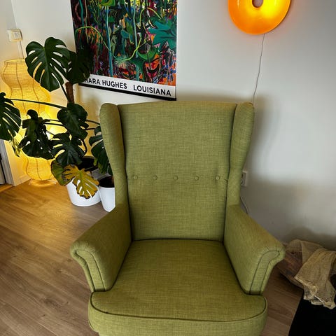 Selger en pent brukt Strandmol ørelappstol fra IKEA med tilhørende forskammel.