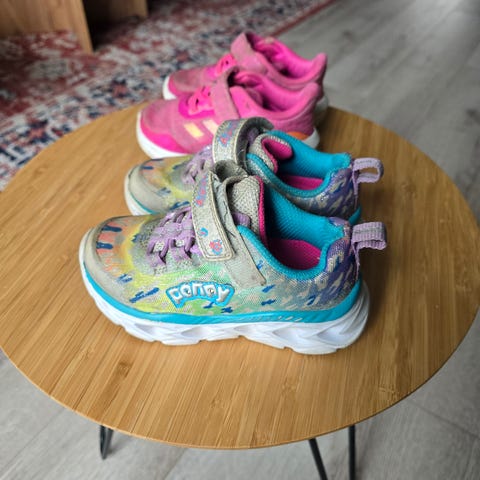 Adidas joggesko for barn i størrelse 24. Skoene er i hvit og rosa farge med borrelåslukking og Adidas-logo på hæl og såle. Overdelen er i syntetisk materiale med tekstilfôr, og yttersålen er i gummi. Modellen er tilpasset jente, men kan brukes av alle som ønsker denne typen sko. Egner seg til hverdagsbruk og lett aktivitet.