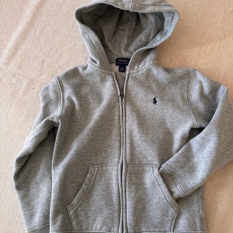 Polo Ralph Lauren hettejakke for gutt i størrelse 10-12 . Genseren er grå og laget av bomull. Modellen har glidelås i front, hette og to lommer foran. Diskré Polo-logo på brystet.