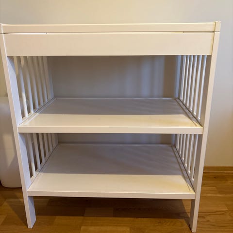 IKEA Gulliver stellebord i hvit utførelse. Stellebordet har to åpne hyller under stelleflaten som gir plass til oppbevaring av bleier, klær og annet stelleutstyr. Åpen konstruksjon med sprosser på sidene gir god oversikt og luft rundt stelleplassen. Egnet til bruk på barnerom eller bad der man trenger en fast stelleplass med lett tilgjengelig oppbevaring.