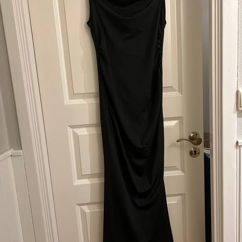Cubus festkjole. Den er svart og har et enkelt, ermeløst snitt som passer til formelle anledninger og festbruk. Materialet er lett og faller rett ned langs kroppen. Passer til dame som bruker størrelse 36/ 38 i kjoler.