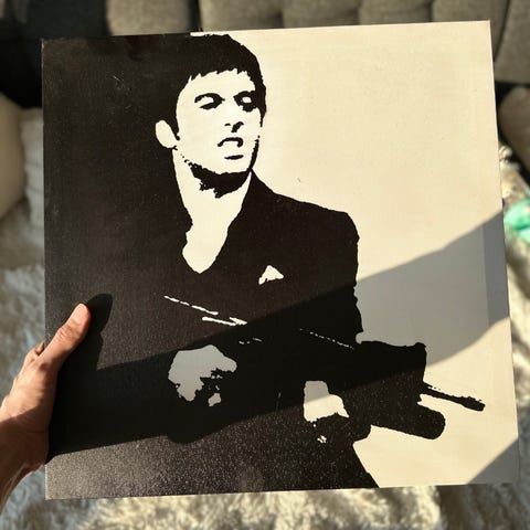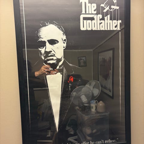 Bilde motiv og tekst fra filmen «The Godfather» (Godfather 1972). Plakaten har svart bakgrunn med hvit tekst og grafisk portrett.