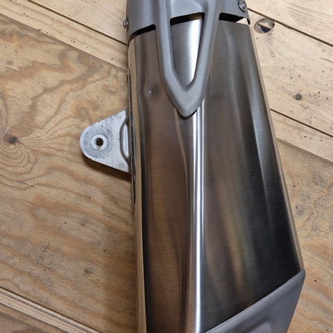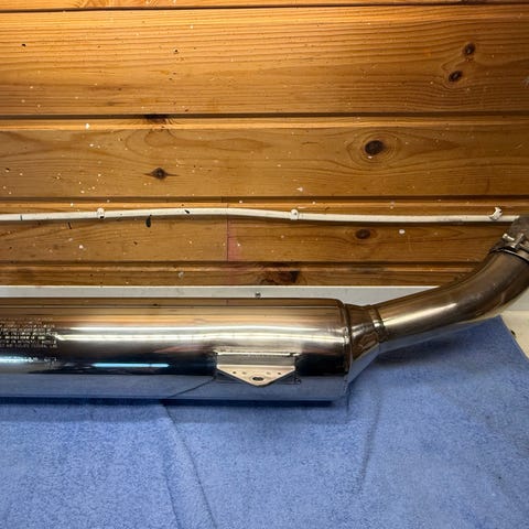 Eksospotte i metall. Rektangulær form med avrundet utløp. Har innfestingspunkter på siden og overgang til rør i den ene enden. Egnet som reservedel eller erstatningseksos til kjøretøy der dimensjoner og tilkobling passer. Merking og teknisk informasjon er preget inn på siden av potten; se bilder for detaljer.