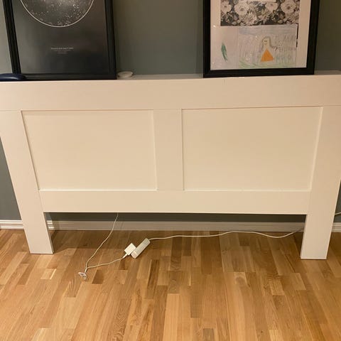 IKEA BRIMNES sengegavl for dobbeltseng. Sengegavlen er beregnet for madrassbredde 180 cm og har integrerte hyller på sidene for oppbevaring av bøker, lamper eller annet tilbehør. Farge hvit. Gavlen står på ben og har paneldelt front. Egnet for plassering mot vegg bak seng i tilsvarende bredde.
