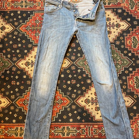 Buksen er pent brukt, uten synlige skader eller slitasje. Kjent for høy kvalitet, italiensk produksjon og detaljer som skiller seg ut fra vanlige jeans.