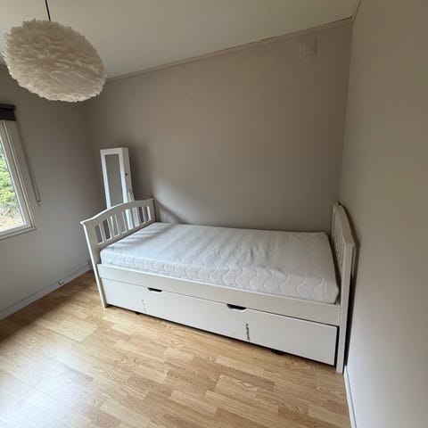 IKEA dagseng med uttrekksseng. Sengen har hvit ramme og består av en hovedseng med ribbebunn og en ekstra uttrekksseng under, også med ribbebunn i tre. Løsningen gir to liggeplasser når uttrekkssengen er trukket ut. Passer til standard enkeltsengmadrasser. Egner seg for barnerom, gjesterom eller rom der det er behov for en plassbesparende senge- og soveplassløsning.