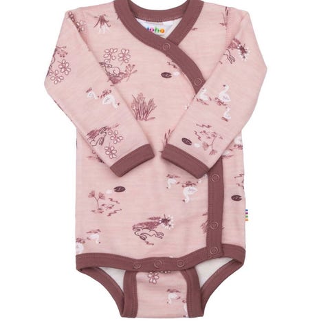 "Body fra Me Mini. Rosa body med print av skog og dyr. Bodyen er i flott kvalitet som er fin for sart barnehud: 50% merinoull og 50% tencell."