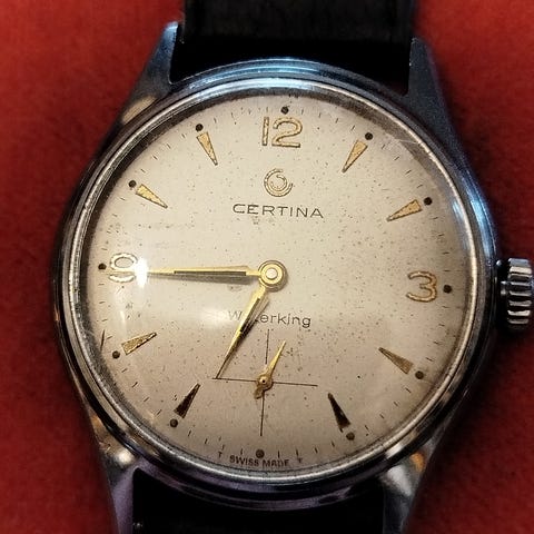 Certina, som sannsynligvis stammer fra midten av 1960-tallet. Klokken er en klassisk mekanisk modell med manuelt opptrekk.
