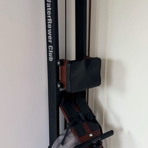 Romaskin WaterRower S4 med vannmotstand og ramme i eik. Maskinen har fotstøtter med justerbare stropper og håndtak koblet til vannmotstandssystemet i tanken foran. Egnet for innendørs rotrening og kondisjonstrening. Kan lagres stående for å spare plass når den ikke er i bruk.