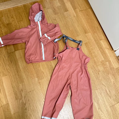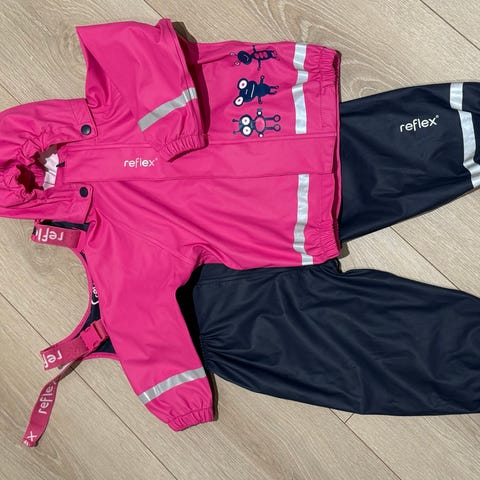 Selger et pent brukt rosa regntøysett fra Reflex i str. 86 og en vinterdress fra H&M i str. 86 😊