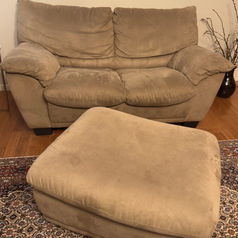 Sofaen er slitt i sittedelen, vi har lagt et teppe over.