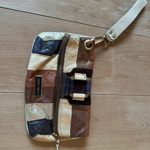 Clutch veske for dame. Vesken har klaff med metall-lås i front og er designet i flere farger i vertikale felt på forsiden, med ensfarget bakside. Innvendig har vesken et hovedrom og en mindre glidelåslomme til oppbevaring av småting. Egnet som håndveske.