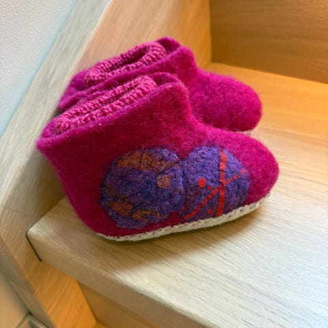 Kjempesøte tøfler i ull, størrelse 21. Perfekt som første tøfler i barnehagen.