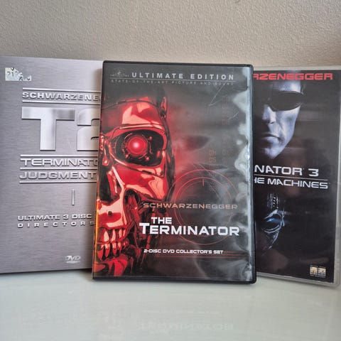 Selger The Terminator, Terminator 2 og Terminator 3 på VHS og DVD. Alle kommer med norsk tekst. Kassettene er veldig fine og DVD platene er som nye. Selges samlet.
