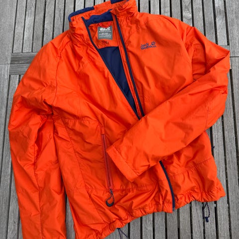 Oransje og vannavvisende treningsjakke eller høstjakke selges for en billig penge. Den er så å si ubrukt. Størrelse L