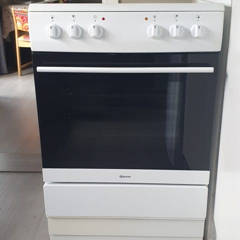 Noe merker på koketoppen, ellers i fin stand og fungerer som den skal. Følger med stekeplater og en rist.
