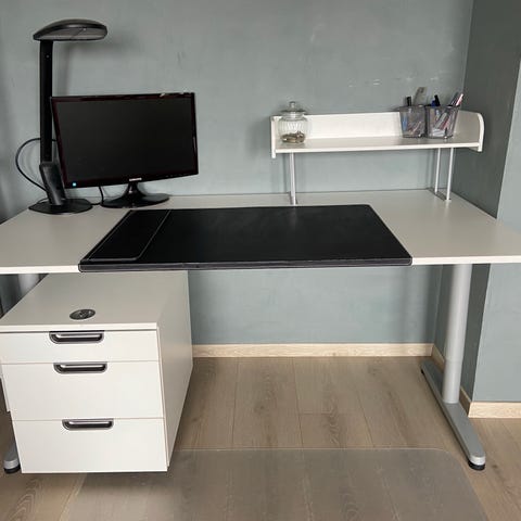 Skrivebordet er opprinnelig en hev/senk-skrivebord. Denne funksjonaliteten fungerer ikke lengre, usikker på hvorfor. Funksjonaliteten har vært lite i bruk. Skrivebordet er ca 12 år gammelt.