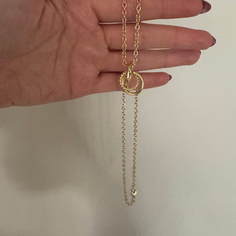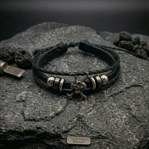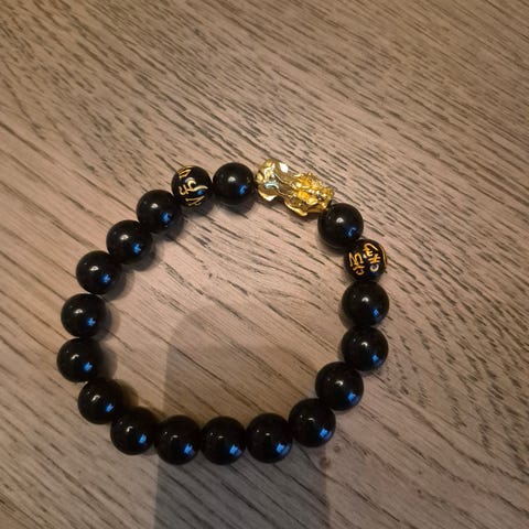 Selger et veldig fint og stilig armbånd i svart med detaljer i gull. Armbåndet har flere lag med ulike teksturer (flettet, kjede, stein) og en dekorativ hjerteform som gjør det ekstra unikt