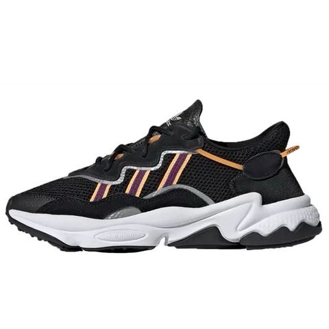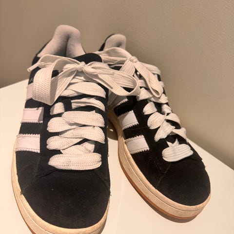 Modellen har svart overdel med hvite Adidas-striper og hvite lisser. Yttersåle i lys gummi.