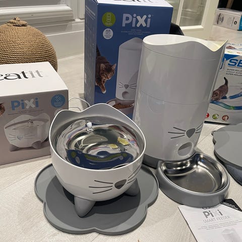 Catit Pixi drikkefontene til katt. Fontenen er utformet som et kattehode og er laget for å gi katten rennende drikkevann. Pakken inneholder selve drikkefontenen og alt man trenger til den. I tillegg følger det med et underlag med kattemotiv som kan plasseres under fontenen eller matskålen for å beskytte underlaget, samt en matskål i metall med fiskebeinmotiv som kan brukes til tørrfôr eller våtfôr. Settet er egnet til innendørs bruk for katt.