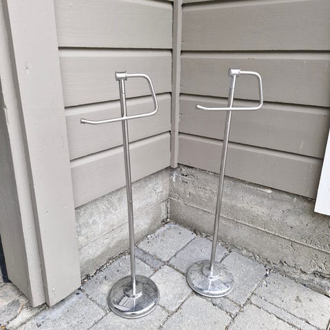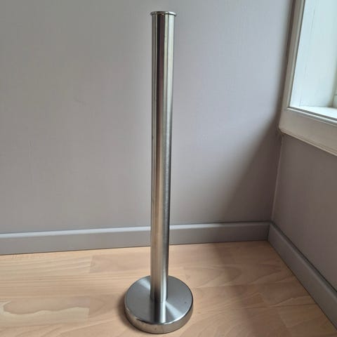 Pen frittstående toalettrullholder i metall med kromfarget overflate. Holderen har en kvadratisk fot som gir stabilitet, en vertikal stang for ekstra toalettruller og en horisontal arm til bruk for rull i bruk. Egnet for plassering på baderomsgulv der man ønsker en flyttbar løsning uten veggmontering.