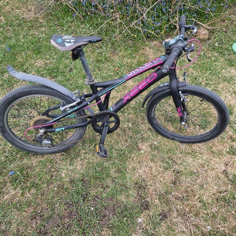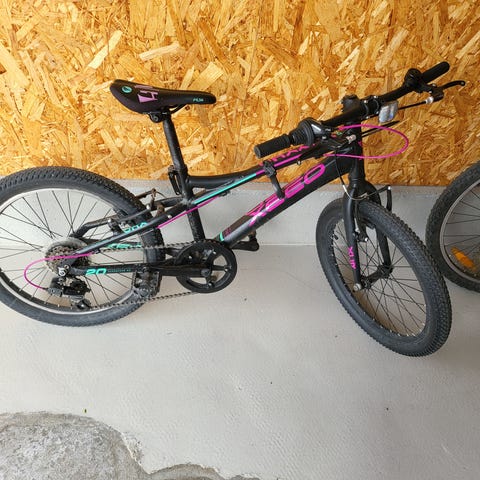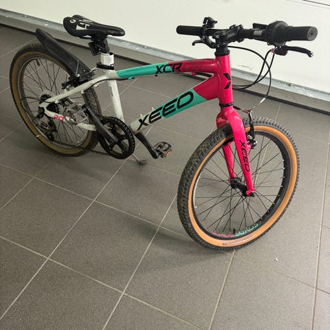 Xeed XC 20 barnesykkel med 20" hjul. Sykkelen har ramme i svart med rosa og turkise detaljer. Utstyrt med dempegaffel foran, felgbremser og girsystem tilpasset barn. Passer til barn som skal over fra mindre barnesykkel til 20" størrelse, til bruk på vei og lette grus- og skogsstier.