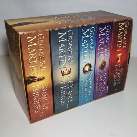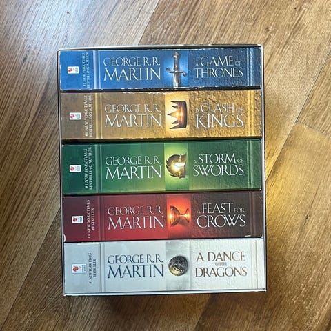 George R.R. Martin boksett med flere titler fra serien A Song of Ice and Fire samt boken Fire & Blood. Bøkene er på engelsk og i pocketutgave. Settet inkluderer blant annet A Game of Thrones, A Clash of Kings, A Storm of Swords, A Feast for Crows, A Dance with Dragons og Fire & Blood. Egner seg for lesere som ønsker hele eller store deler av serien samlet i ett sett.