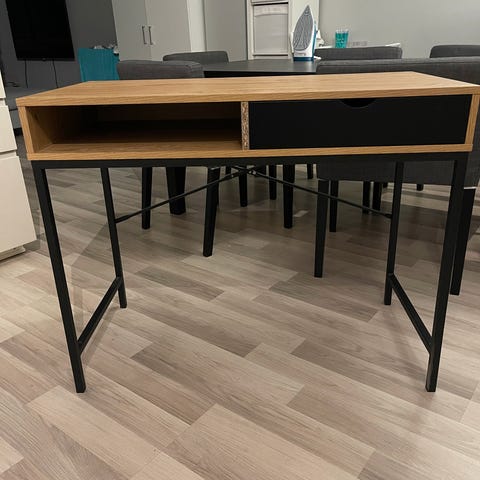 Selger et praktisk grått skrivebord med to skuffer. Perfekt til hjemmekontor, skolearbeid eller gaming.