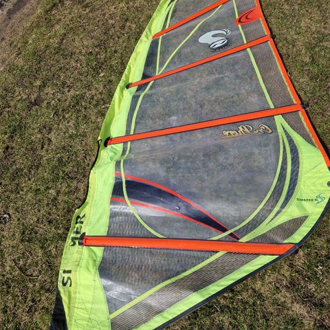 Velbrukt og reparert (se bilder), men skulle stadig kunne duge. Stroppa nede ved nedhalshjørnet av seilet har røket, se bilde. For langt til å kunne sendes.