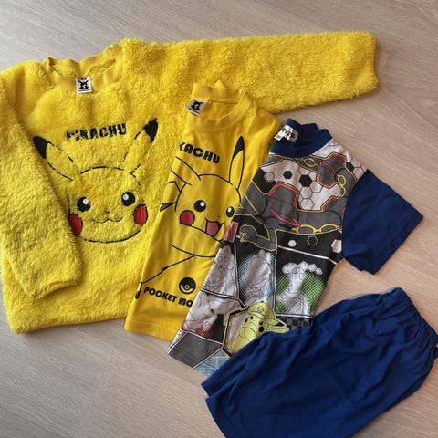H&M pysjamas i bomull for barn, unisex, størrelse 110. Sett med langermet overdel og lang bukse. Flerfarget trykk på blå bunn, Pokemon mønster Mykt bomullsmateriale
